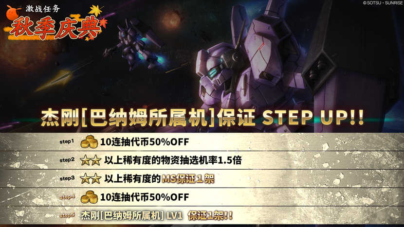 - ・STEP5(代币30枚):杰刚[巴纳姆所属机]LV1保证1架!