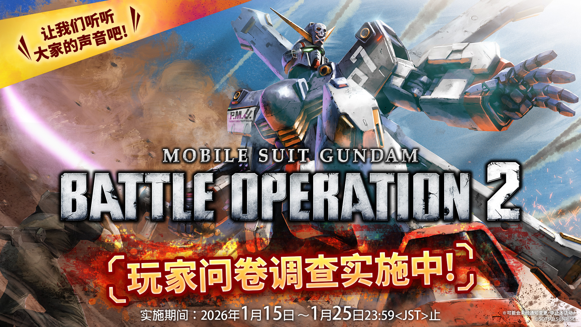 2026.01.15 玩家问卷调查实施公告 ■2026/1/15 14:00 感谢大家一直以来对『机动战士高达 激战任务2』的支持。 目前正对玩家实施相关问卷调查。 【实施期间】 2026年1月15日(周四)14:00<JST> ~ 2026年1月25日(周日)23:59<JST>[预定] 参与问卷调查请点击下方连结,让我们听听您宝贵的建议吧! https://survey.bandainamcoent.co.jp/jfe/form/SV_emxD5UPtrrPIa34