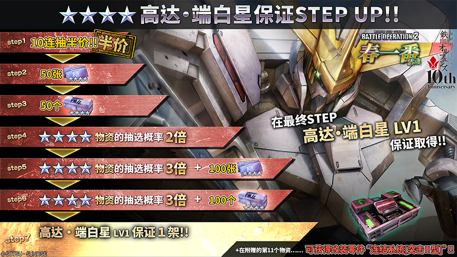 - ・STEP1(15枚代币):精选的4架强力机体中保证抽到1架&10连半价!