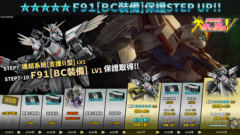 - ・STEP10(代幣30枚):「F91[BC装備] LV1」保證再1架!!