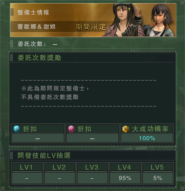⇒ 蕾歐娜&甜妲為 「大成功機率100%」及「開發技能LV必定達4以上」的特殊整備士。