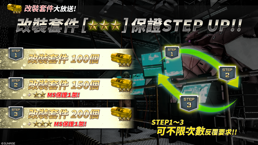 - ・STEP3(代幣30枚):特贈改裝套件[★★★] 200個!+★★★以上MS保證1架!