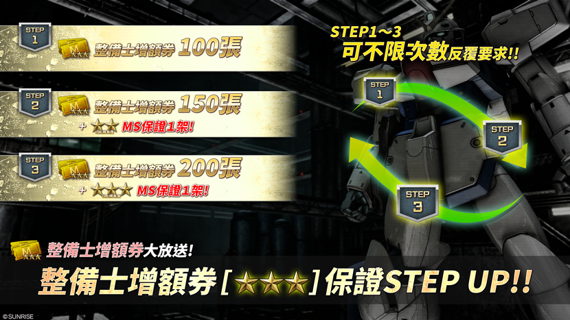 - ・STEP3(代幣30枚):特贈整備士增額券[★★★] 200張!+★★★以上MS保證1架!