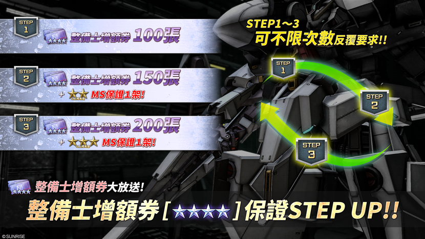 - ・STEP3(代幣30枚):特贈整備士增額券[★★★★] 200張!+★★★以上MS保證1架!