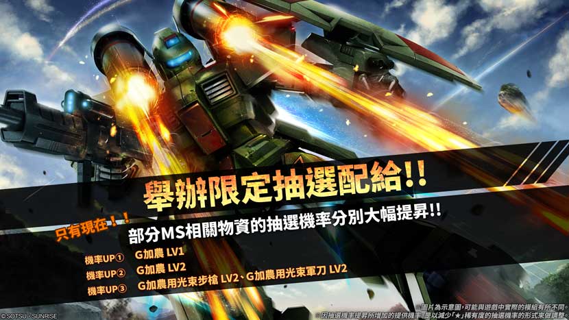 - 限定抽選配給將會針對目標機體各LV,主武裝等提高各自的抽選機率。