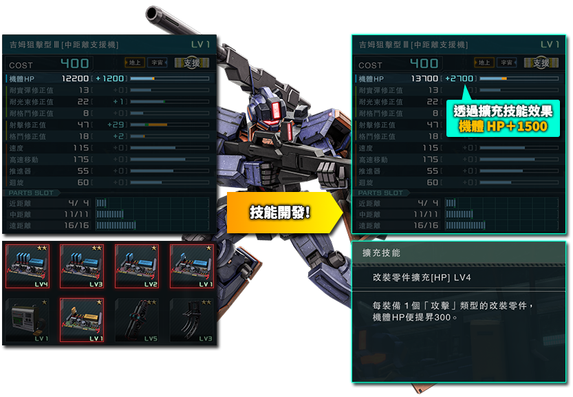 擴充技能名 條件 效果 各技能LV的上升值 LV1 LV2 LV3 LV4 LV5 改裝零件擴充[HP] 性能會隨著「攻擊」「防禦」「特殊」型改裝零件每裝備1個而增加 機體HP增加 50 100 200 300 400 盾牌HP增加 50 100 150 200 300 - 機體HP會隨著裝備特定類別改裝零件而增加的本技能
