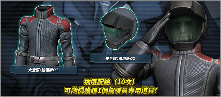 - ※期間內只要進行抽選配給(10次)就會自動進行第11次的抽選配給,就可隨機獲得駕駛員專用道具1個。