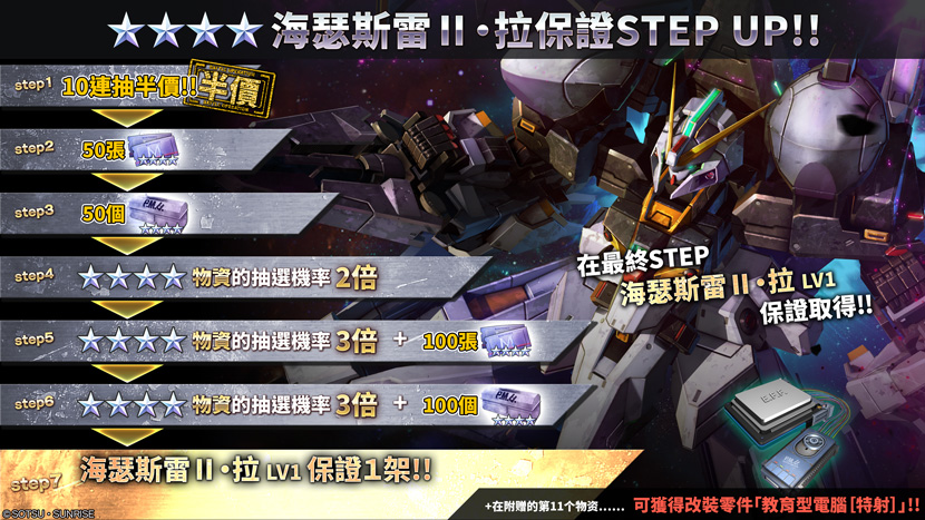 - ・STEP6(代幣30枚):★★★★物資的抽選機率3倍!+ 保證獲得改裝套件[★★★★]100個!