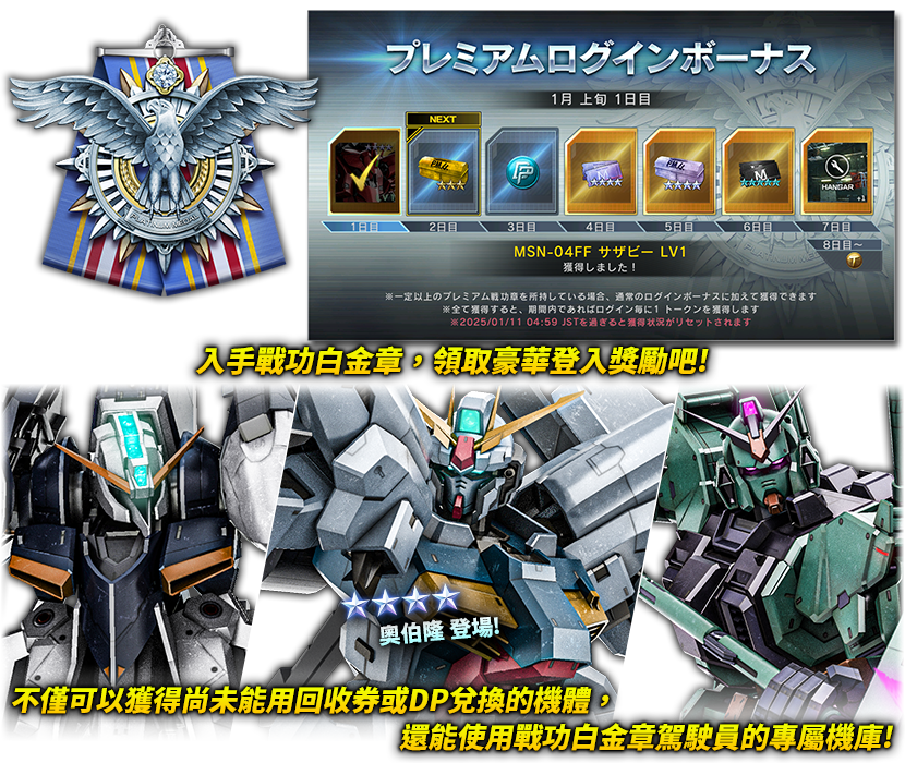 - ※獲領「戰功白金章」的隔天5:00AM<JST>之後,才能獲得豪華登入獎勵。