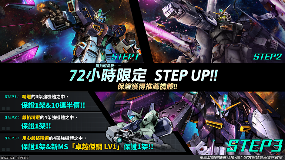 - ・STEP3(30枚代幣):更加精選的4架強力機體中保證抽到1架!!且「卓越傑鋼 LV1」保證1架!
