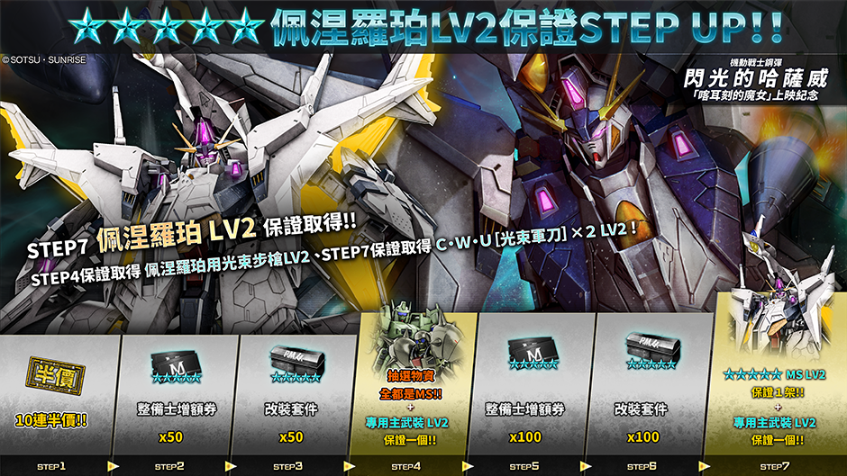 - ・STEP4 (30枚代幣):抽選物資全部都是MS!+第11個物資必定獲得佩涅羅珀用光束步槍 LV2!