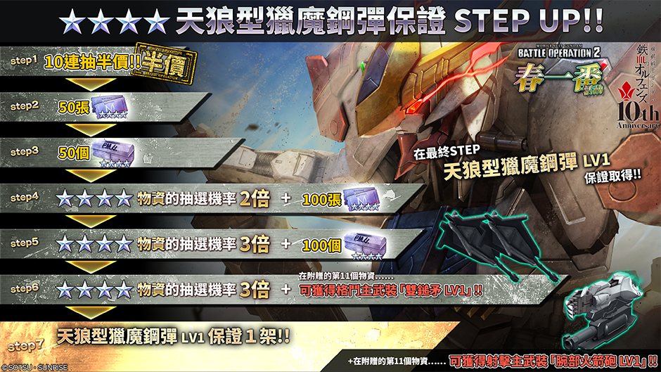 - ・STEP1(15枚代幣):精選的4架強力機體中保證抽到1架&10連半價!!